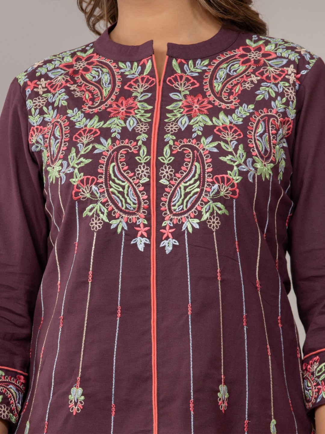 Step into the spotlight with this stunning Embroidered Cotton Flex Co-ord Set in a rich, delicious wine shade!