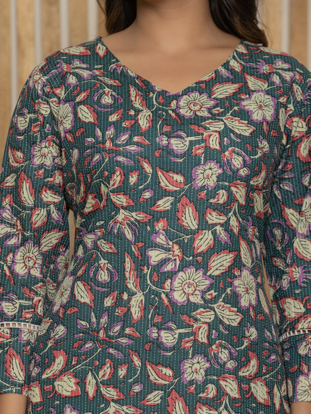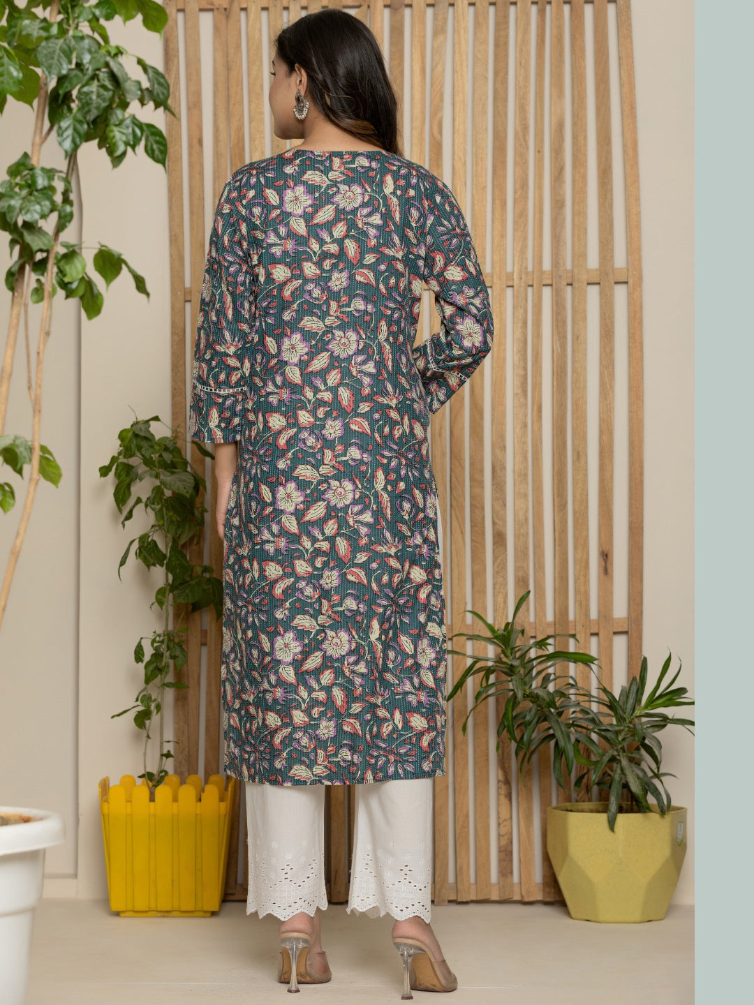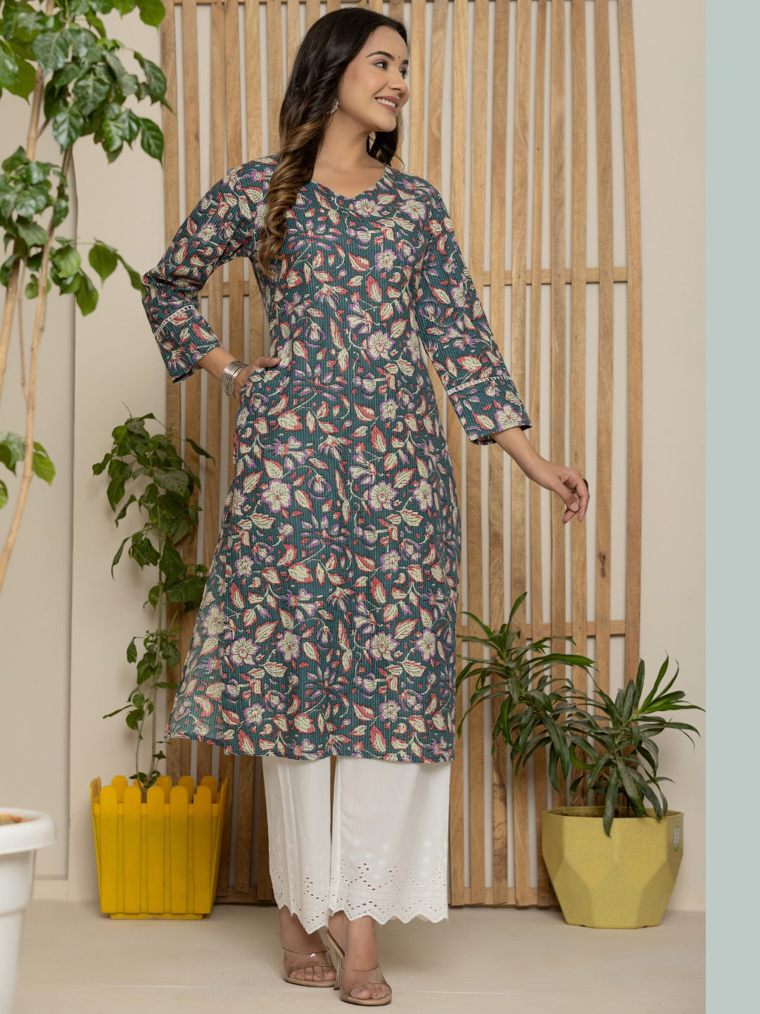 Expertly crafted from soft and breathable cotton katha fabric, this straight cut kurta features delicate crochet lace detailing on the sleeves and a flattering V-neckline. With eye-catching floral prints in vibrant colors, it's perfect for daily wear, office attire, college outfits, or casual outings. A stylish and comfortable choice for any occasion.