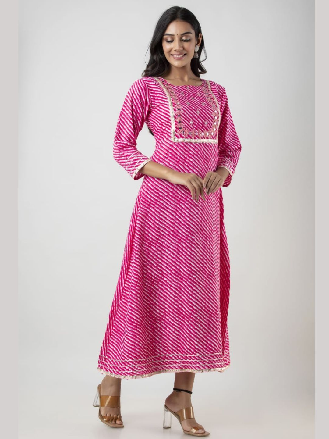 Look effortlessly stylish with this traditional Cotton Lehariya Print A-line Kurta! With its subtle yet stunning Gotawork and beautiful hand embroidered yoke, pink is sure to make you stand out in a crowd. Perfect for any occasion, you'll feel like a queen with this must-have piece!