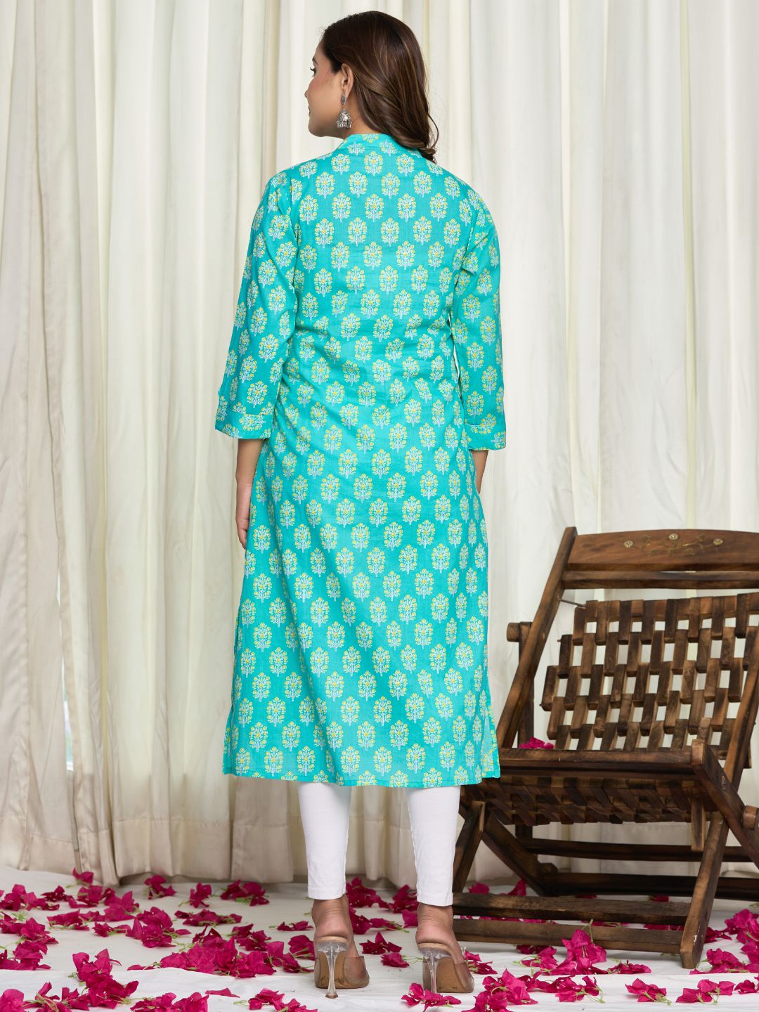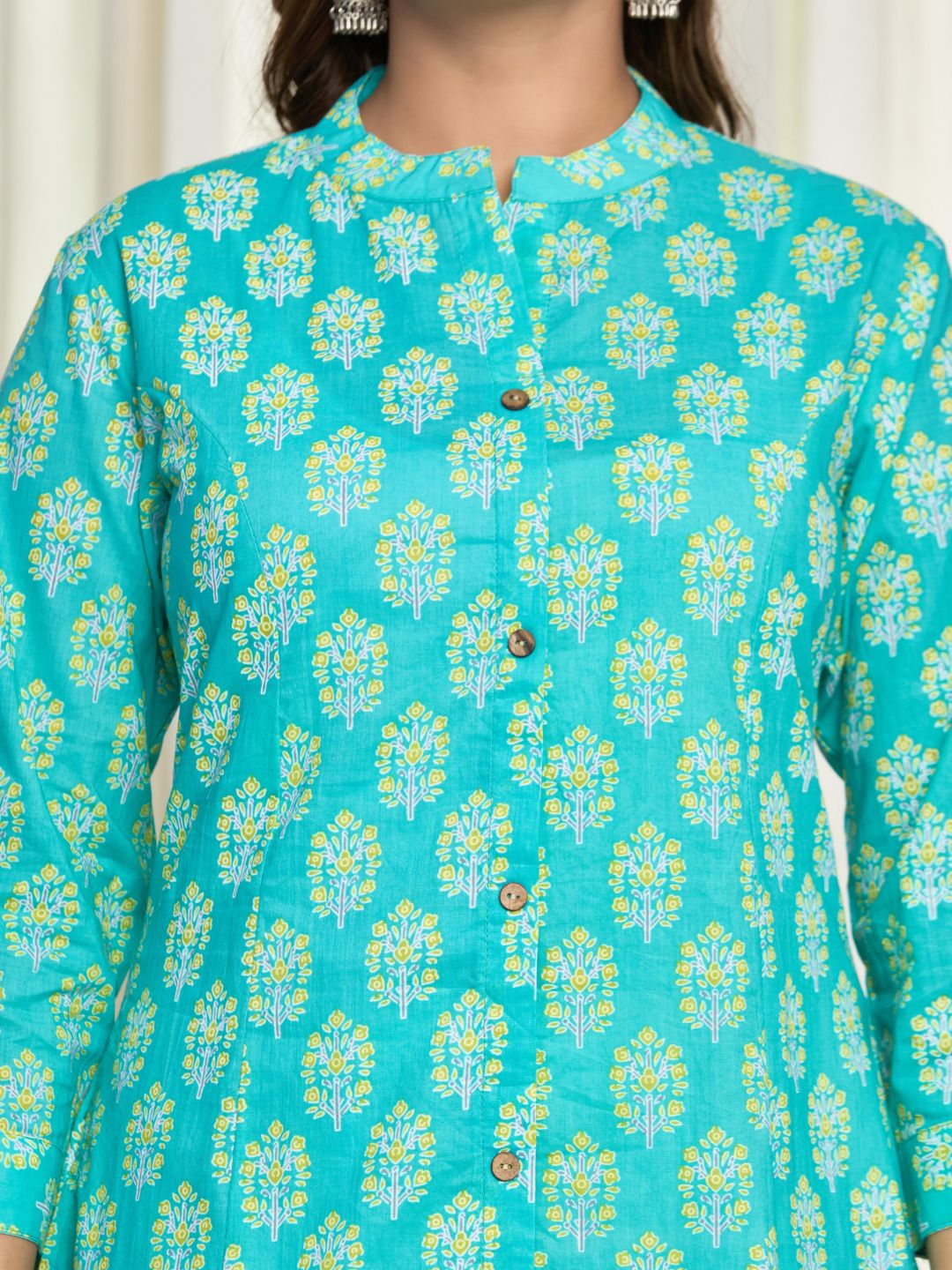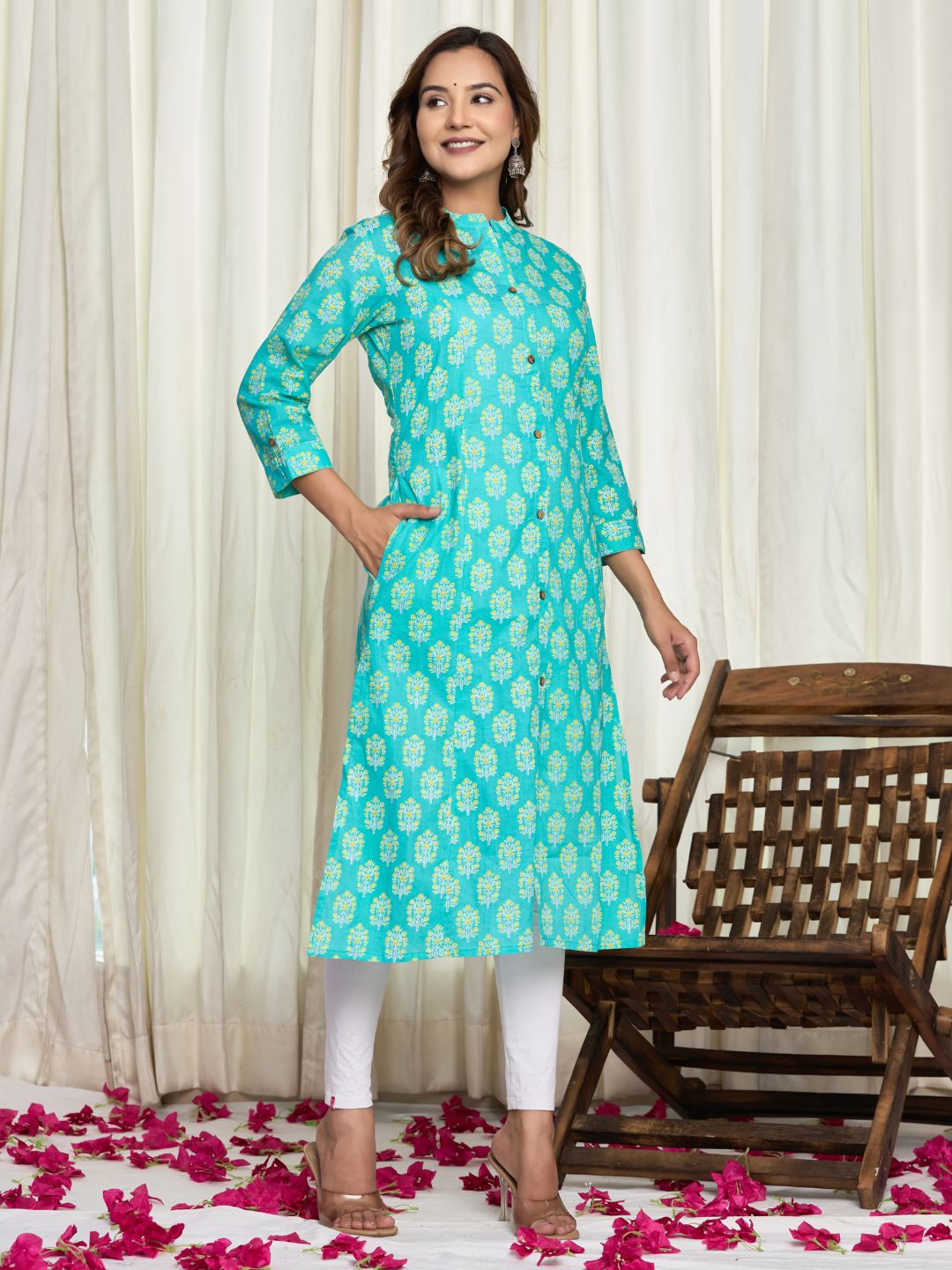 Expertly crafted from soft and breathable cotton fabric, this A-line Princess cut kurta features Collared Neck with Button Detail . With eye-catching floral prints in vibrant colors, it's perfect for daily wear, office attire, college outfits, or casual outings. A stylish and comfortable choice for any occasion.
