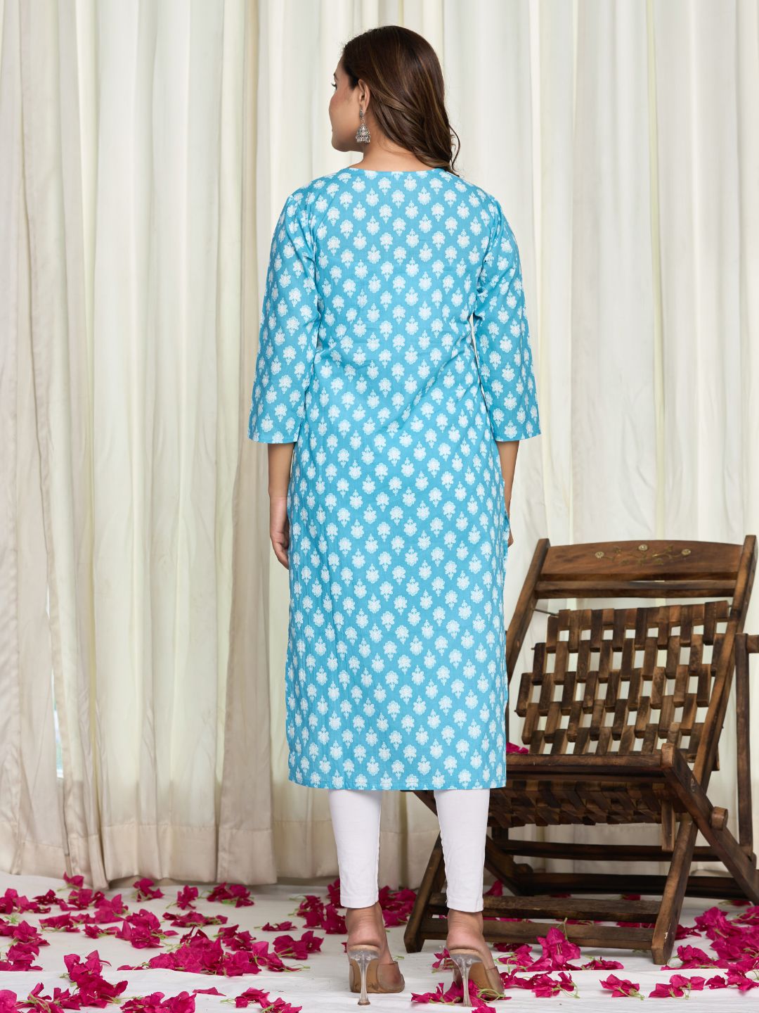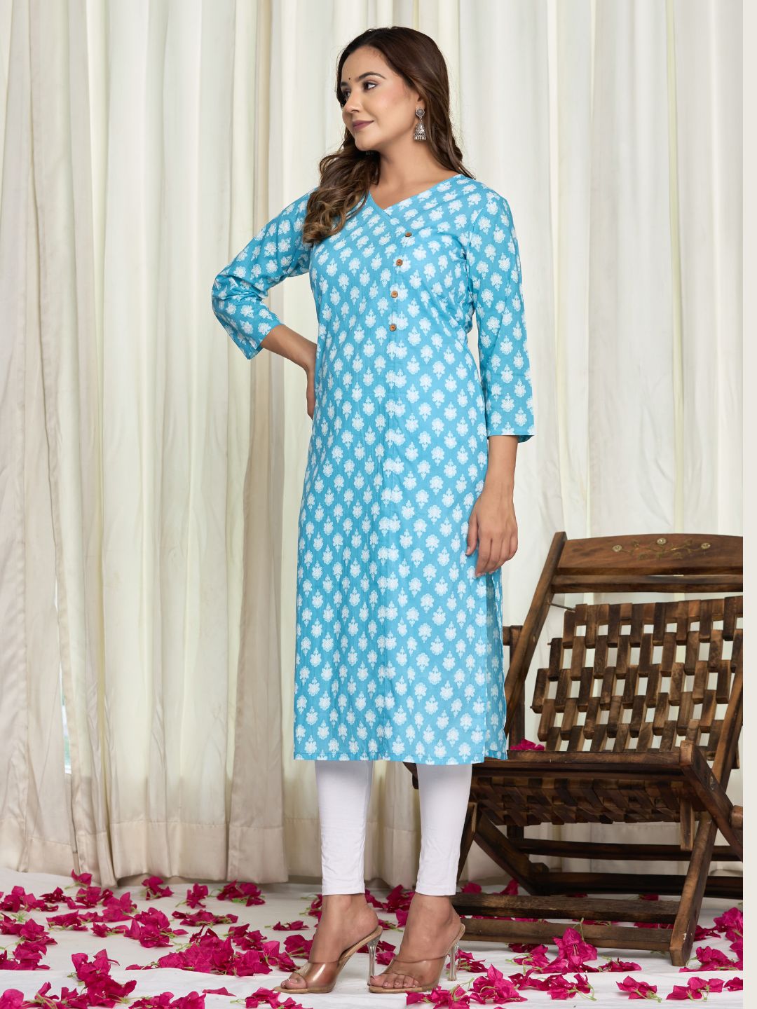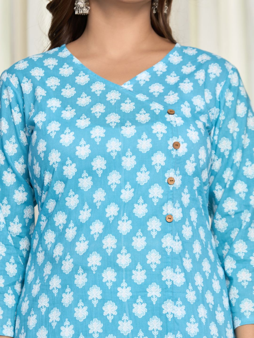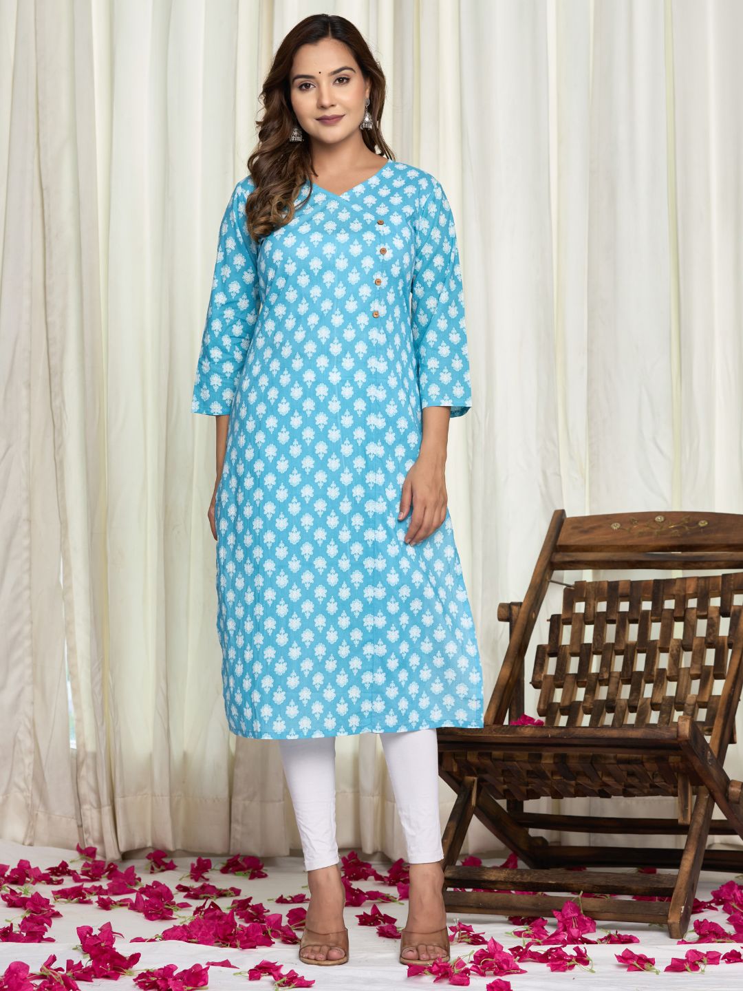 Expertly crafted from soft and breathable cotton fabric, this straight cut kurta features Angrakha Style V Neck with Button Detail . With eye-catching floral prints in vibrant colors, it's perfect for daily wear, office attire, college outfits, or casual outings. A stylish and comfortable choice for any occasion.