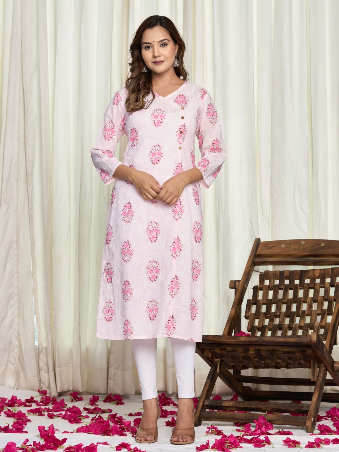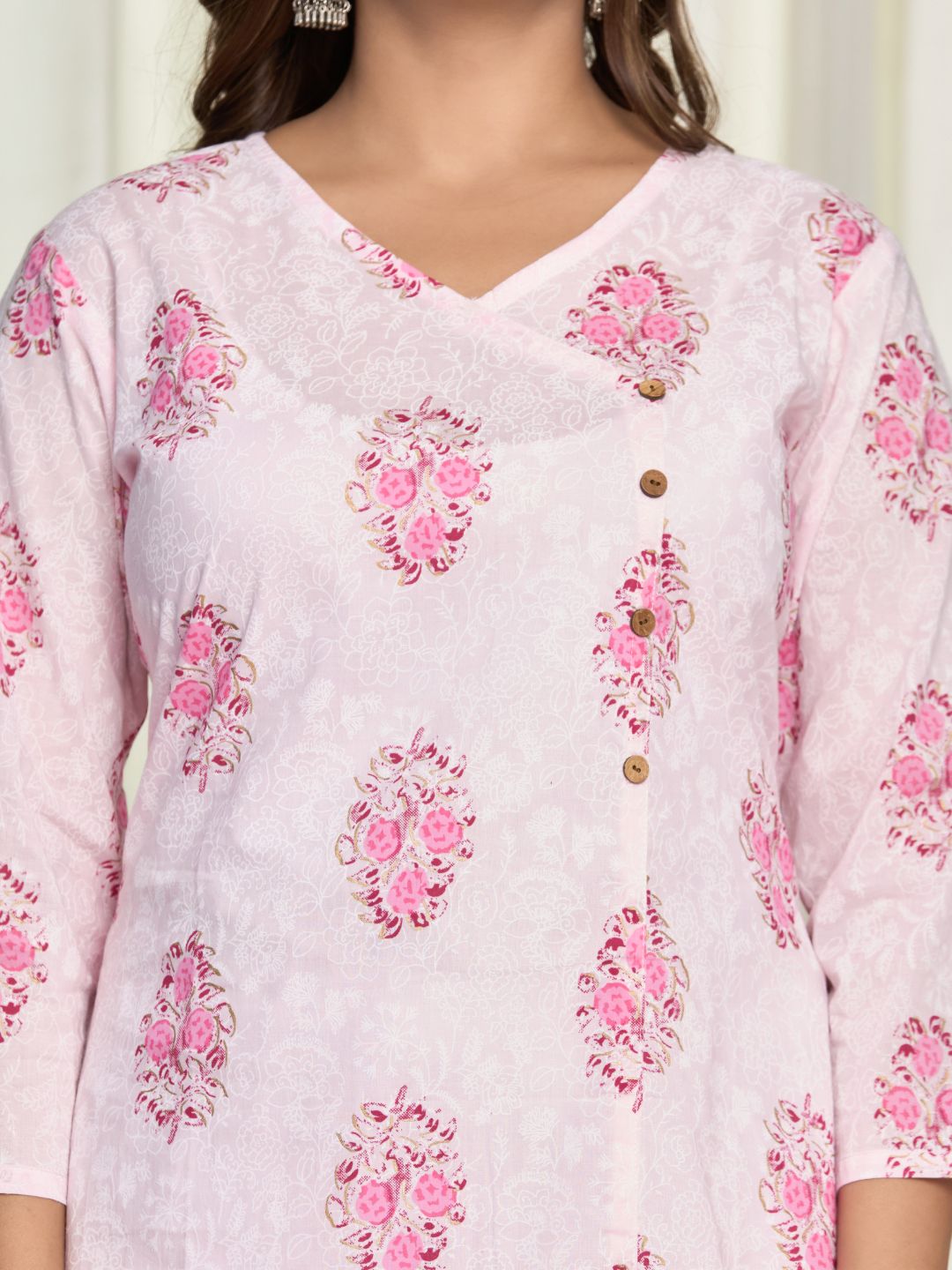 Expertly crafted from soft and breathable cotton fabric, this straight cut kurta features Angrakha Style V Neck with Button Detail . With eye-catching floral prints in vibrant colors, it's perfect for daily wear, office attire, college outfits, or casual outings. A stylish and comfortable choice for any occasion.