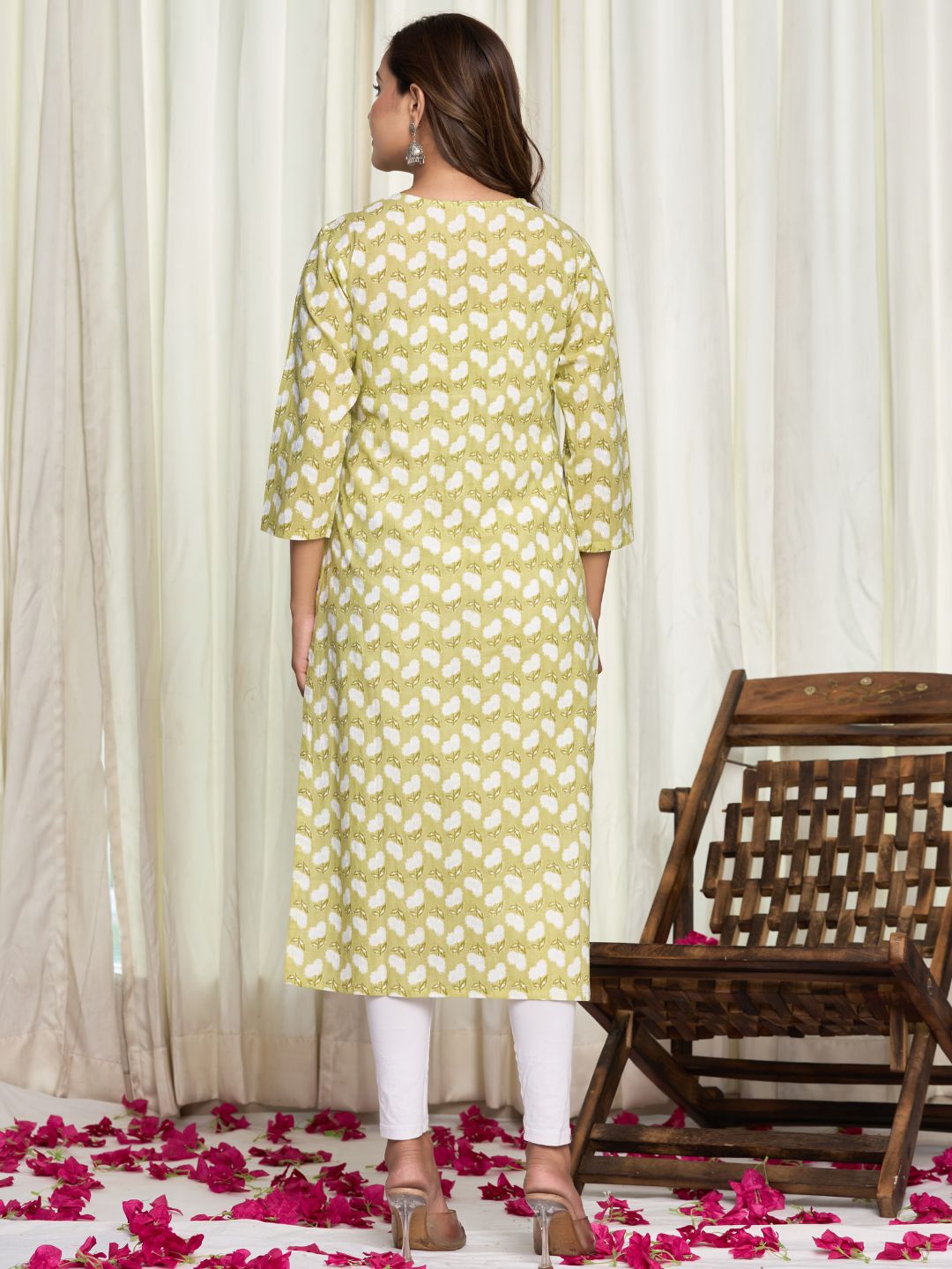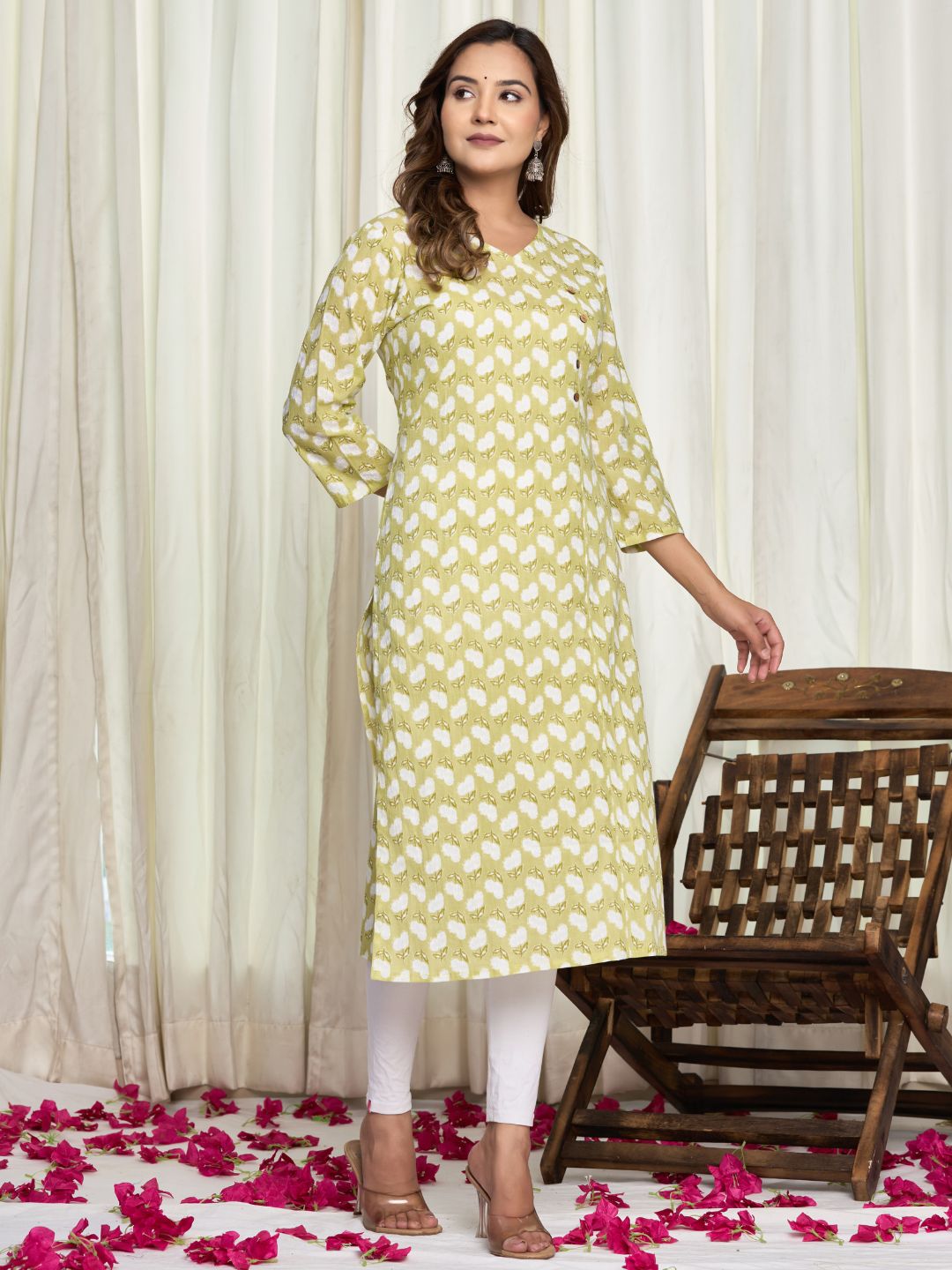Expertly crafted from soft and breathable cotton fabric, this straight cut kurta features Angrakha Style V Neck with Button Detail . With eye-catching floral prints in vibrant colors, it's perfect for daily wear, office attire, college outfits, or casual outings. A stylish and comfortable choice for any occasion.