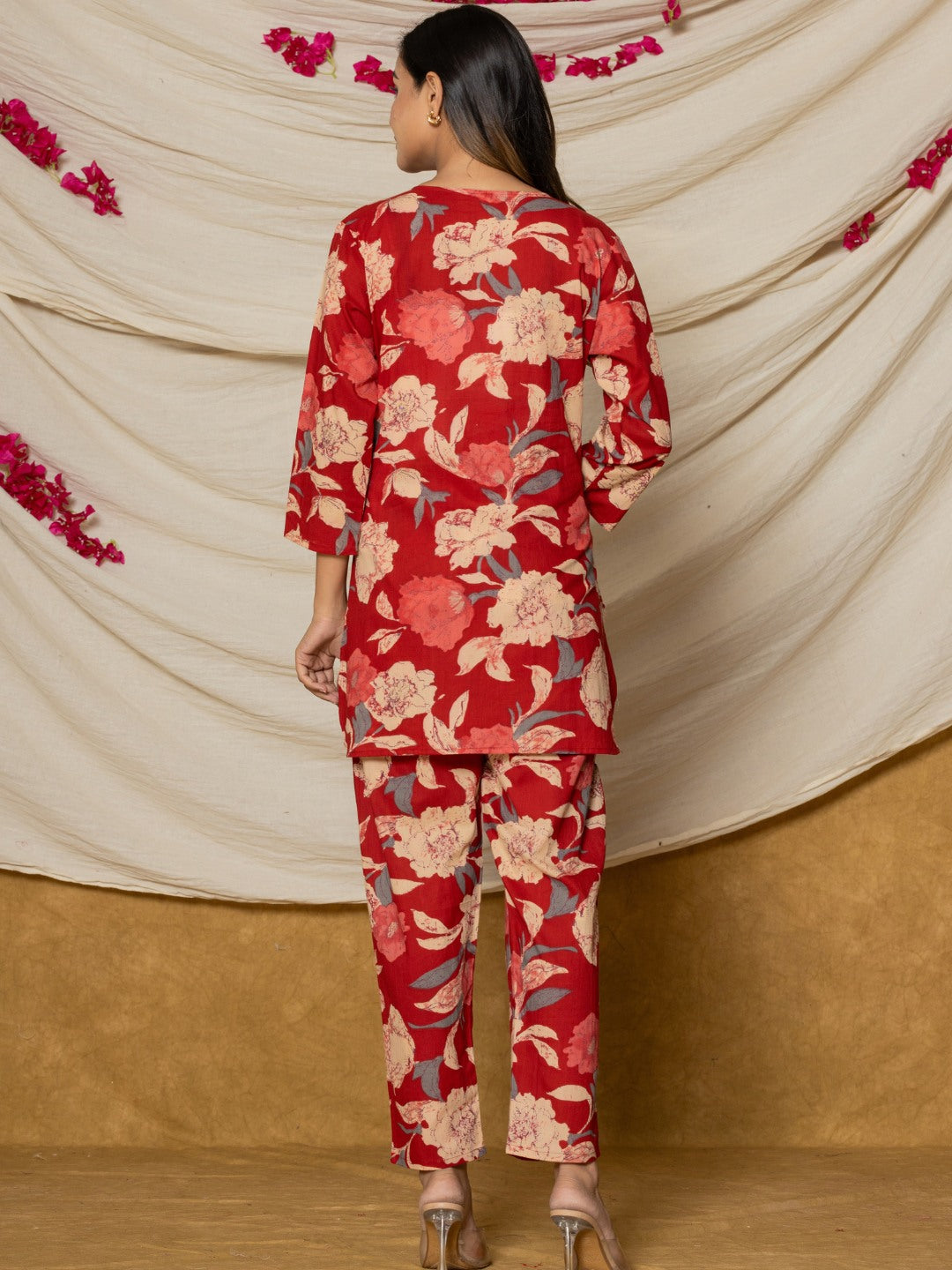 Look effortlessly stylish and comfortable with our Floral Print Pure Cotton Co-Ord Set - Red. Featuring a playful multi-color floral print, hip length top, and pants with an all-around elastic and a convenient side pocket. Enjoy a relaxing stay-in or fun outings with friends while looking fab!