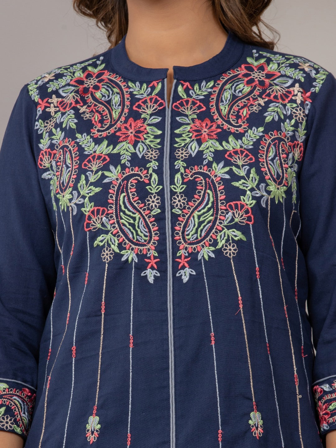 - Vibrant, folk-inspired embroidery
