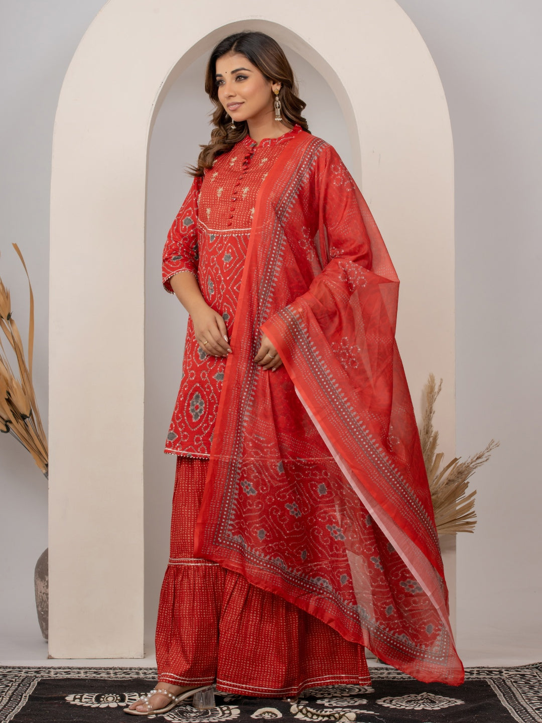 Get ready to turn heads at every celebration with this stunning three-piece wonder! This pure cotton ensemble brings together the best of traditional craftsmanship—a graceful medium-length A-line kurta adorned with vibrant bandhani prints and handwork, paired with a beautifully tiered sharara featuring gorgeous gota details that catch the light with every twirl. The matching digital print dupatta ties the whole look together perfectly. Whether you're attending a wedding or festive gathering, this red beauty promises comfort, style, and that coveted "where did you get that?" moment. Pure cotton means you'll stay cool and comfortable while looking absolutely fabulous.