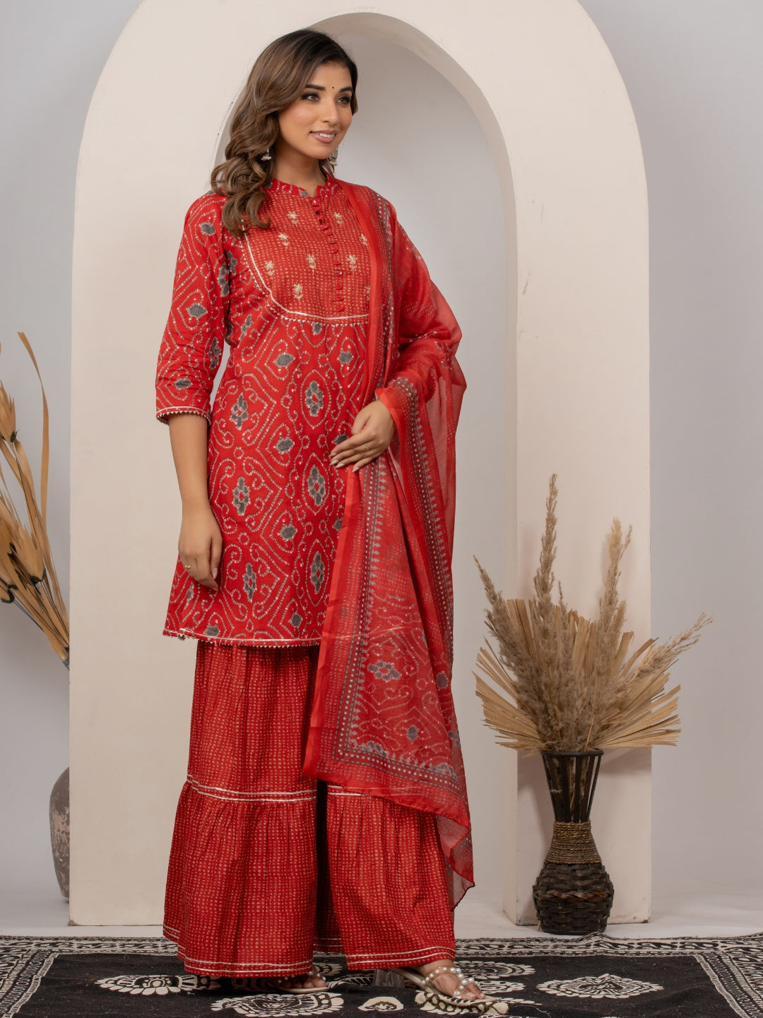 Pure Cotton Bandhani Print HandWork Kurta, Sharara and Dupatta Set - Red