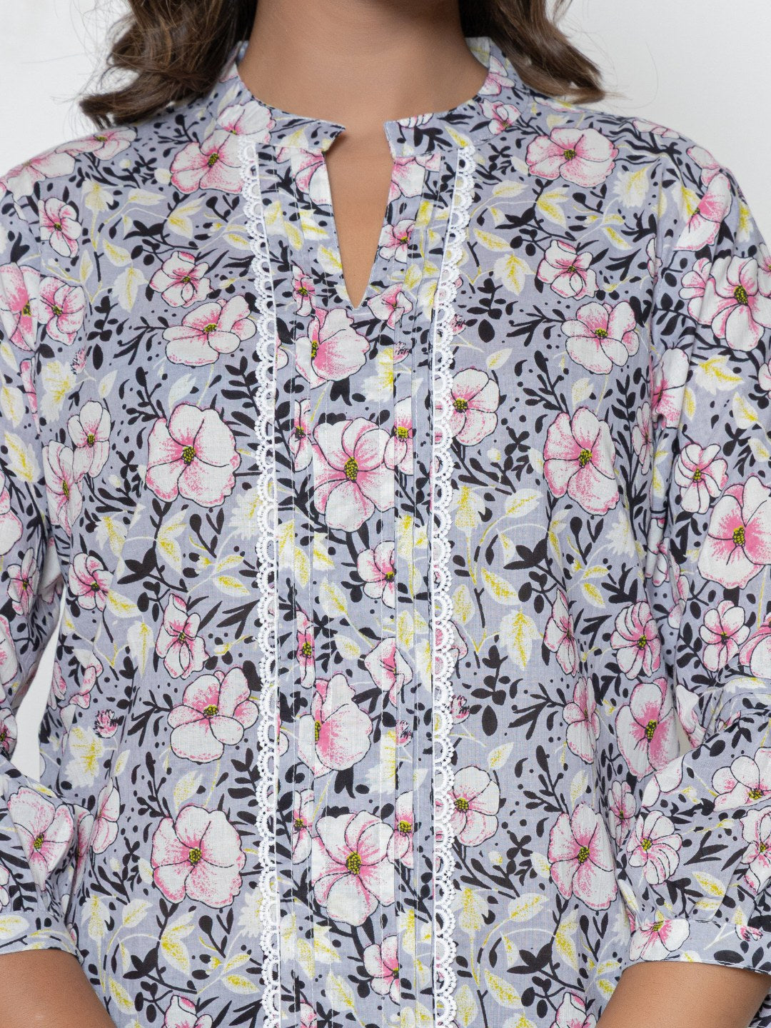 Pure Cotton Printed Pleted Top with Lace detail - Light grey